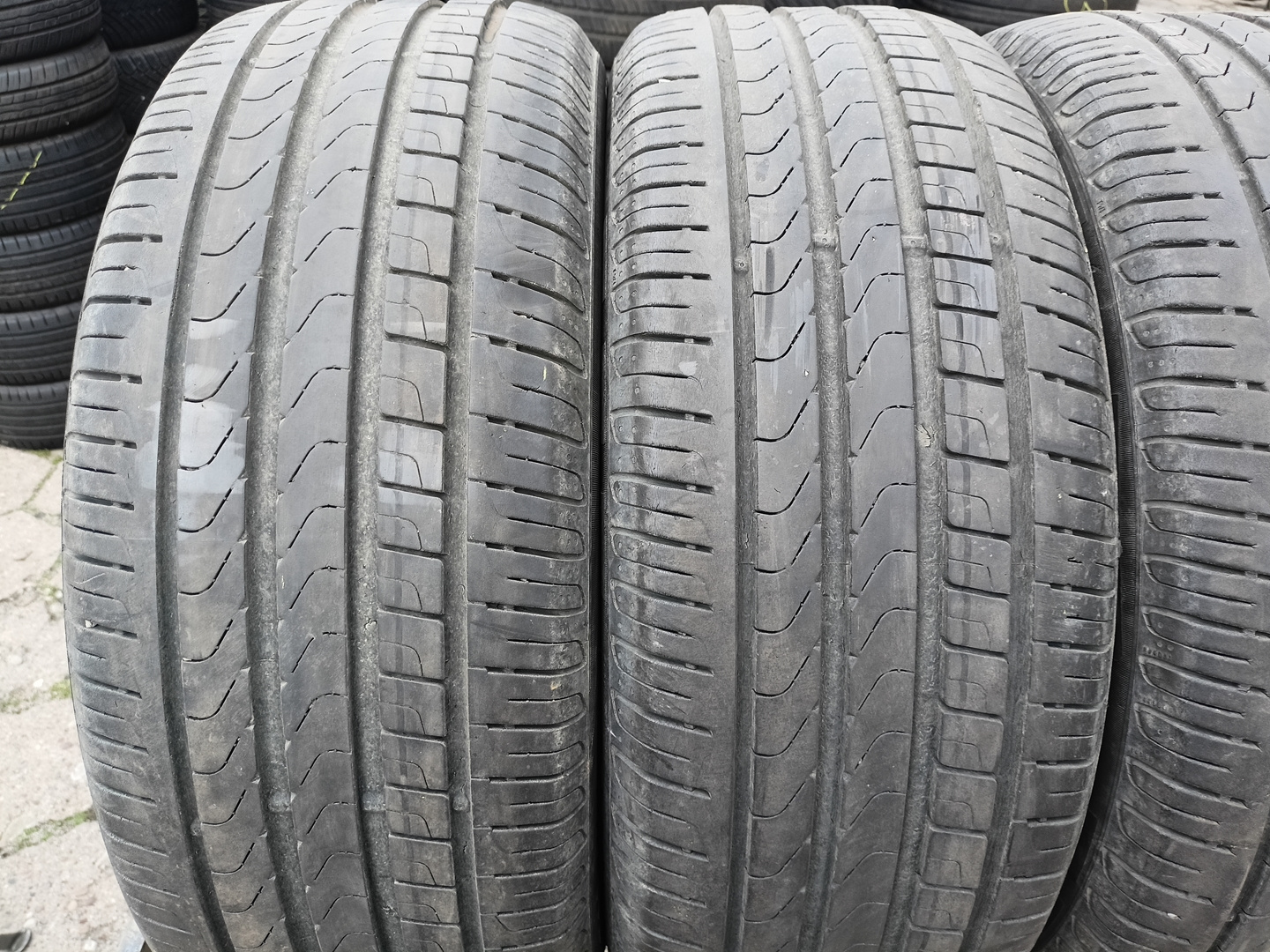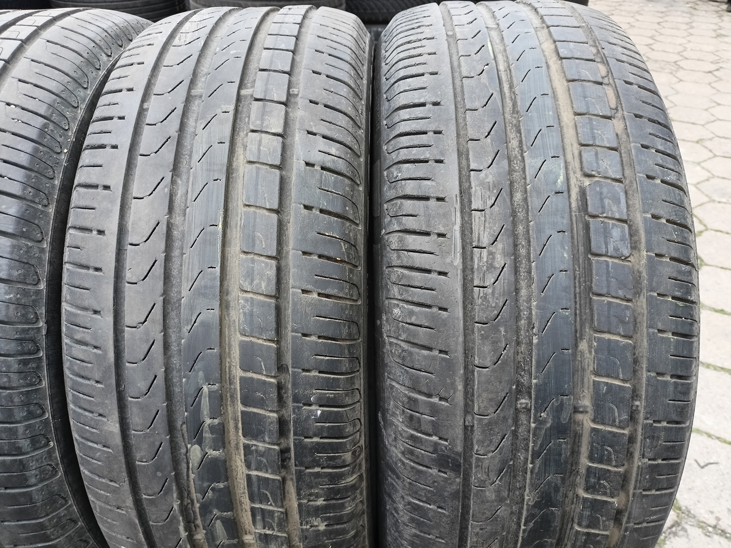 Opony używane, sprawdzone ciśnieniowo, nie posiadają wybrzuszeń. Opony posiadają delikatnie spękany bieżnik.
